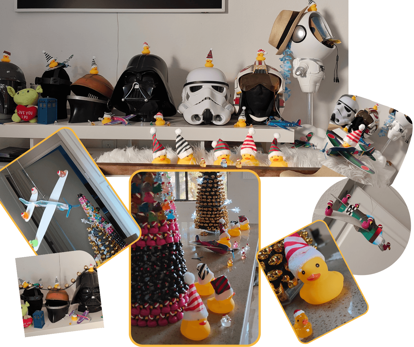 I also got little foam glider planes and hung them about the house with duckies and flamingos on them. I thought I was going to have ducks everywhere, covering everything, but apparently one needs far more ducks than I had budgeted for to do that. So we have a decent sprinkling of Christmas-hatted ducks around the house.